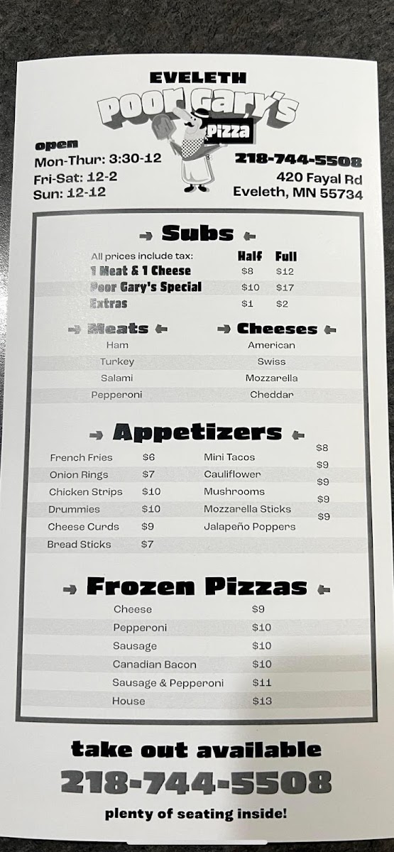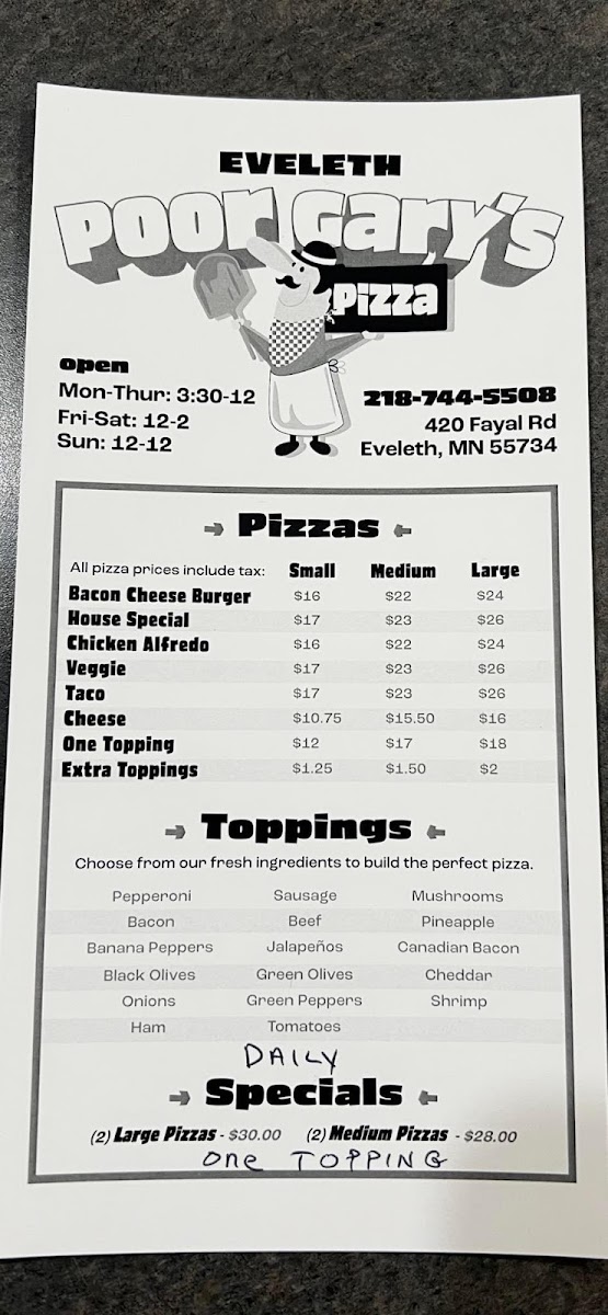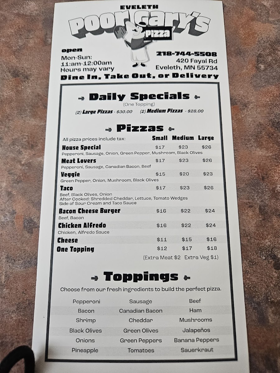 Welcome to Poor Gary's Pizza of Eveleth, a beloved spot that's been revitalized to deliver mouthwatering flavors! Located at 420 Fayal Rd, Eveleth, MN, this pizzeria offers a menu brimming with classic favorites and enticing appetizers.